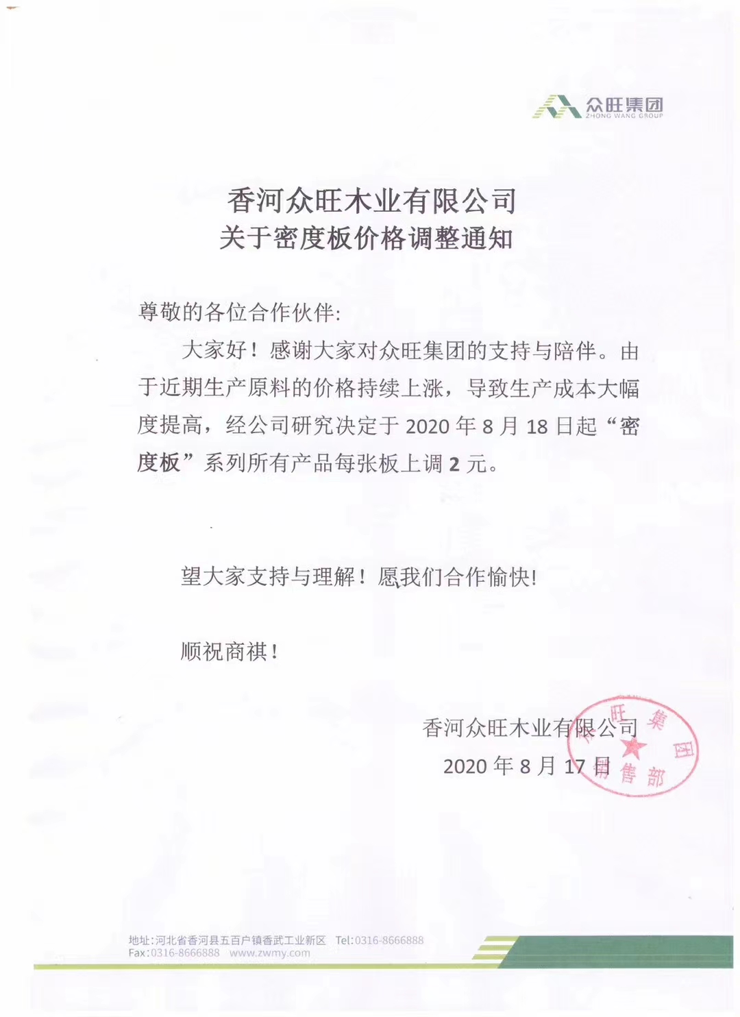 大家好!感謝大家對眾旺集團的支持與陪伴。由于近期生產原料價格持續上漲,導致生產成本大幅提升,經公司研究決定于2020年8月18日起“密度板”系列所有產品上調2元/張。